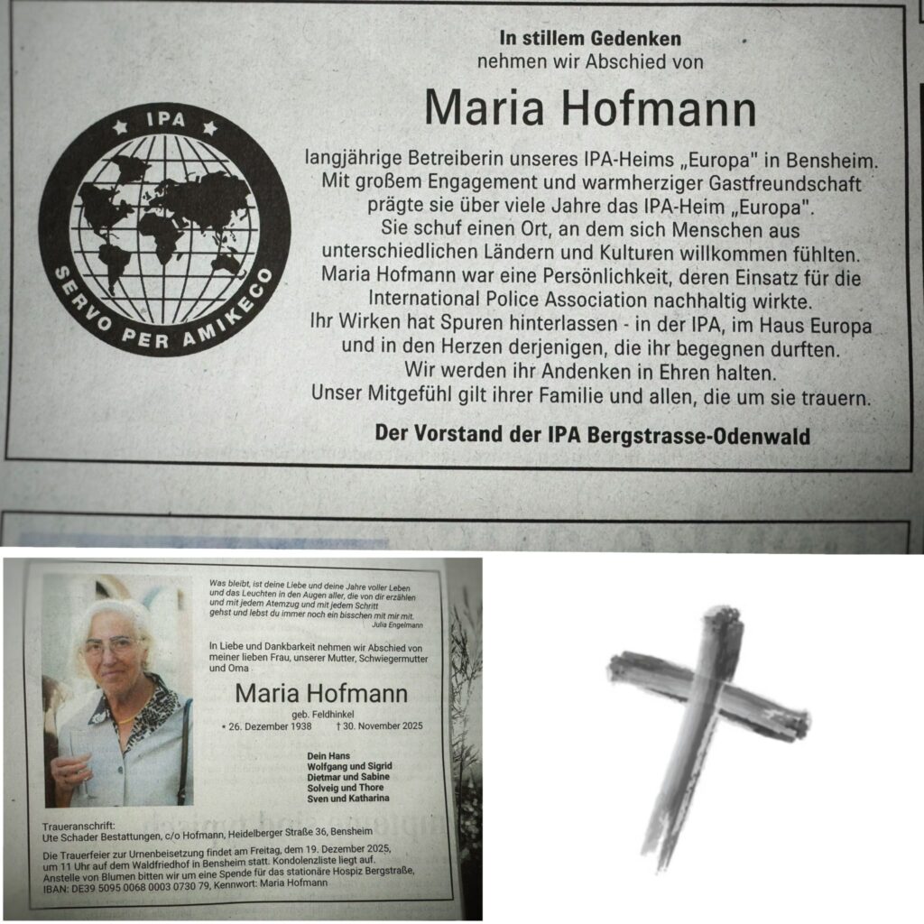 Mit großer Traurigkeit haben wir vor Weihnachten Abschied genommen von Maria Hofmann, unserer langjährigen Betreiberin unseres IPA-Heims Haus Europa in Bensheim. Die Beerdigung war sehr ergreifend und von einer spürbaren Verbundenheit geprägt. Es war zudem ein Ausdruck der Wertschätzung, die Maria weit über den Kreis derjenigen hinaus erfahren hat, die sie persönlich kannten.