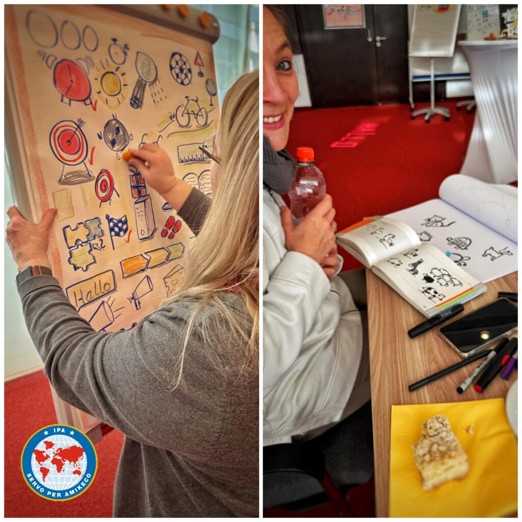 Geleitet wurde die Fortbildung von Ulla Simonis, Dozentin an der Hessischen Hochschule für öffentliches Management und Sicherheit (HöMS) sowie erfahrene Visualisiererin und Kreativ-Coach. Gleich zu Beginn der Veranstaltung nahm sie vielen die Scheu vor dem Zeichnen, mit dem Versprechen: „Auch wer denkt, er könne nicht zeichnen, wird überrascht sein, was möglich ist, es steckt in jedem von uns.“ Und tatsächlich: Mit jedem Übungsschritt wurde sichtbar, wie sich die zeichnerischen Fähigkeiten der Teilnehmenden entwickelten. Es war eine spürbare Freude im Raum, als festgestellt wurde, dass wirklich jede und jeder in der Lage war, gängige Piktogramme, Symbole und Strukturen umzusetzen, oft viel besser, als zunächst gedacht. Simonis betonte den Mehrwert visueller Kommunikation in allen Lebensbereichen: „Unsere Welt wird bunter und informativer durch visuelle Hilfestellungen. ob im Dienst, im Ehrenamt oder im privaten Umfeld. Wenn Inhalte sichtbar werden, können wir sie leichter verstehen, erinnern und mit anderen teilen.“