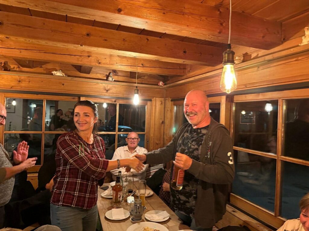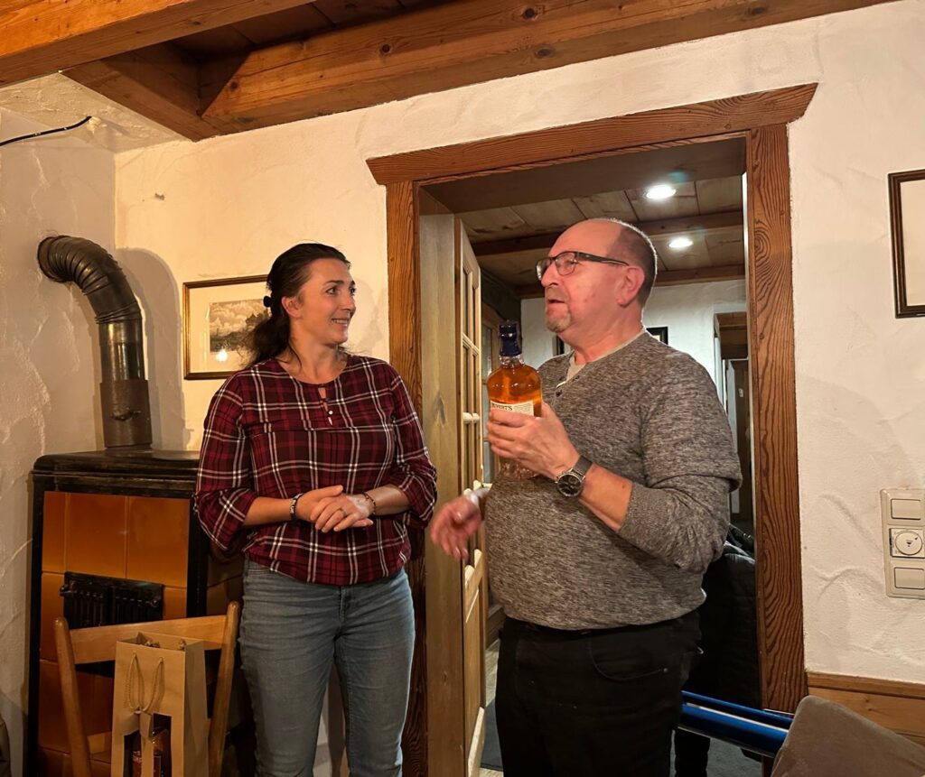 Zum feierlichen Abschluss des Abends nutzte die neue Leiterin die Gelegenheit, um zwei langjährige Stützen der Verbindungsstelle zu ehren: den ehemaligen Leiter Michael Reichenbach und den ehemaligen Schatzmeister, Franz Olbricht. Als herzliches Dankeschön für ihren unermüdlichen Einsatz wurde beiden ein besonderer, feiner Whisky überreicht, den die neue Leiterin eigens aus Kanada eingeflogen hatte.