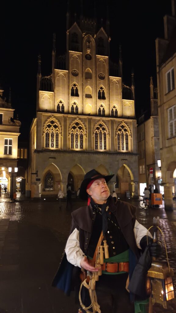 Um 21 Uhr, wieder am Rathaus angekommen, hören wir das Tuten unserer Türmerin oben im Lambertikirchturm und unsere Zeit mit dem feschen Musketier ist um…