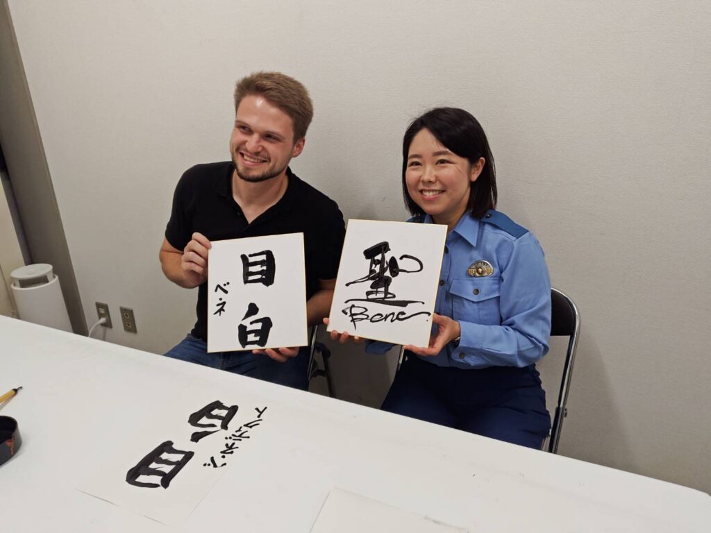 Mit Leichtigkeit fing sie an die Bedeutung meines Namens als Schriftzeichen, sogenanntem „Kanji“, zu Papier zu bringen. Überwältigt davon, war dann aber wieder ich an der Reihe. Da das Kanji doch eher anspruchsvoll war, durfte ich „Mejiro“ und meinen Namen in der japanischen Lautschrift „Katakana“ schreiben. Das war zum Glück unter Anleitung etwas einfacher.