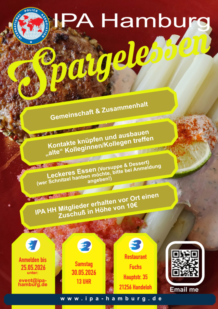 Die IPA Hamburg veranstaltet wieder im bekannten Restaurant FUCHS das jährliche Spargelessen für ihre Mitglieder, Freunde und Gäste. Es wird eine Vorsuppe, leckeren Spargel mit Schinken (wahlweise mit Schnitzel) und ein Dessert zu einem günstigen Preis für uns serviert.